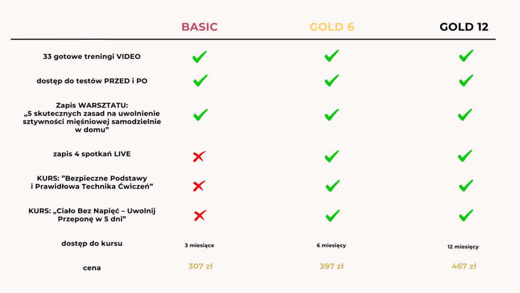 A przeznaczając ok. 75 zł na KURS zaczniesz czuć się w końcu dobrze w swoim ciele, bo tutaj chodzi o Twój komfort, sprawność i zdrowie na przyszłość, a nie o chwilową przyjemność!